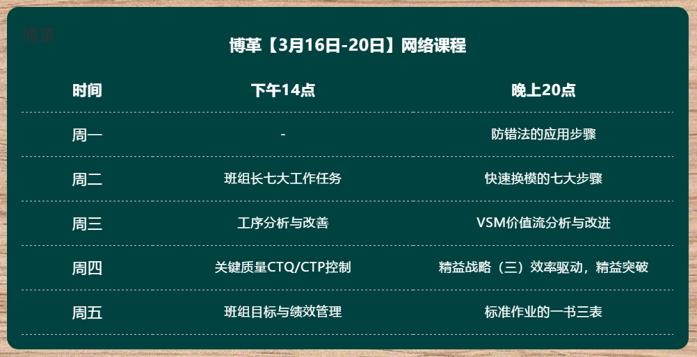 為助力企業在抗疫期間的穩健發展,博革咨詢特推出騰訊課堂線上直播《金牌班組長培訓》《企業精益戰略實施》《精益工具應用》等內訓精品課程,與您共渡難關!