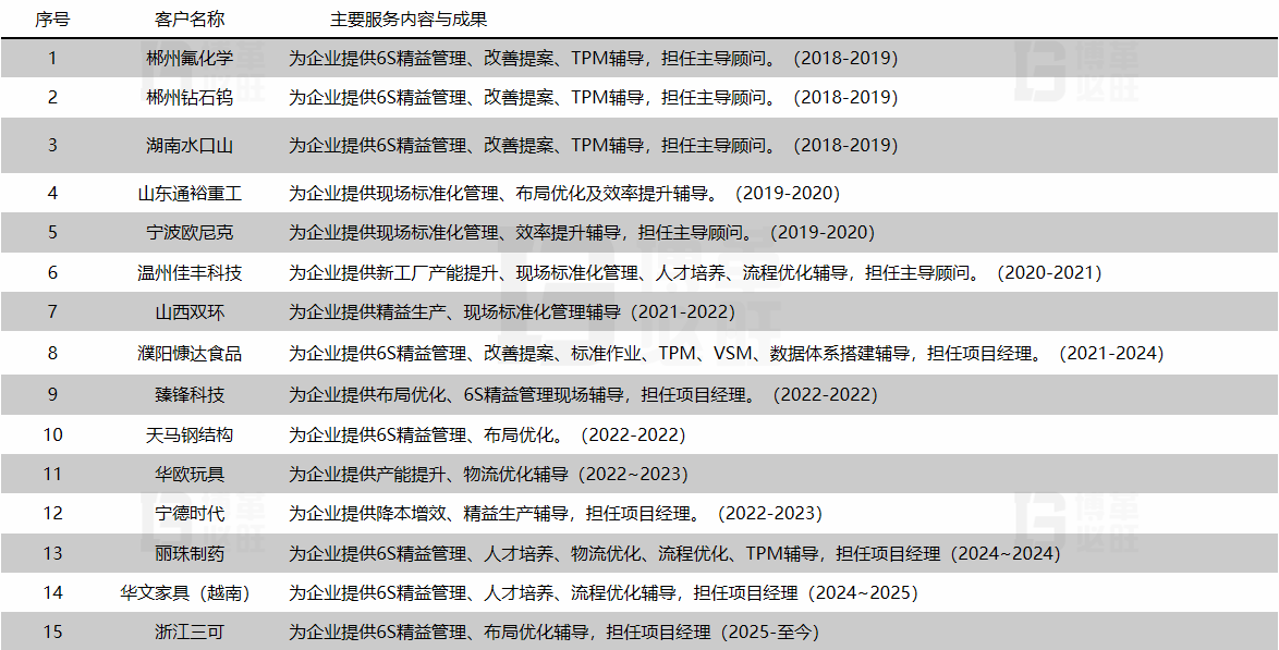 實戰(zhàn)經(jīng)驗:擁有14年的精益管理項目推行與培訓(xùn)經(jīng)驗,專注于通過精益管理幫助企業(yè)達成降本增效目標(biāo)。在日本進行過精益管理深造,并在跨國公司擔(dān)任精益管理推動負(fù)責(zé)人。對企業(yè)降本增效,企業(yè)精益人才培養(yǎng),企業(yè)流程優(yōu)化,品質(zhì)改善提升,布局優(yōu)化,6S精益管理等,具備豐富的實戰(zhàn)經(jīng)驗。擅長幫助企業(yè)建立完善的精益體系,運用QCC、VSM等精益管理方法,幫助企業(yè)達成PQCD改善目標(biāo)。專注務(wù)實,是落地式精益管理的踐行者。曾主導(dǎo)多家大型企業(yè)精益管理項目,幫助客戶達成了集團年度精益管理目標(biāo)。