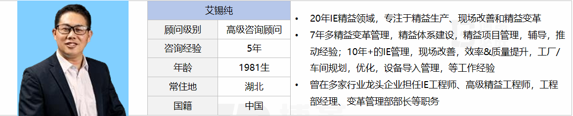 擅長業務:精益管理體系建設和完善能力,精通精益生產、質量體系完善,阿米巴、6S、數據治理等,擅長運用新技術、創新性思維發現并提出改進建議;IE體系建設和完善能力,精通新產品導入,質量策劃,產品結構優化,可制造性評估,質量風險評估,工藝排布,標準工時測定,標準人力,標準產能規劃,標準作業系統建立與維護,線平衡分析, 工廠/車間布局與優化、生產資源規劃,現場改善,設備工裝導入評估;新廠房的整體規劃布局;熟悉智能化,數字化,自動化布局,AGV&RGV應用,智能倉儲應用等。