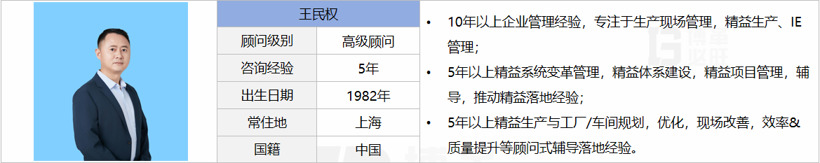 咨詢能力介紹 專注于制造行業(yè)生產(chǎn)現(xiàn)場管理、保交付、降本增效,咨詢輔導(dǎo)企業(yè)達(dá)20+,擅長工廠布局、車間裝修、產(chǎn)線設(shè)計(jì)、二次配,來料-配送-生產(chǎn)-入庫-出貨全流程設(shè)計(jì);自動化立庫、WMS、MES和BI看板等數(shù)字化系統(tǒng)導(dǎo)入;精益生產(chǎn)推行、工藝標(biāo)準(zhǔn)化、標(biāo)準(zhǔn)工時(shí)及制造成本、人力及設(shè)備提效、去庫存、減少浪費(fèi)等現(xiàn)場管理,經(jīng)濟(jì)收益可達(dá)20%~50%。