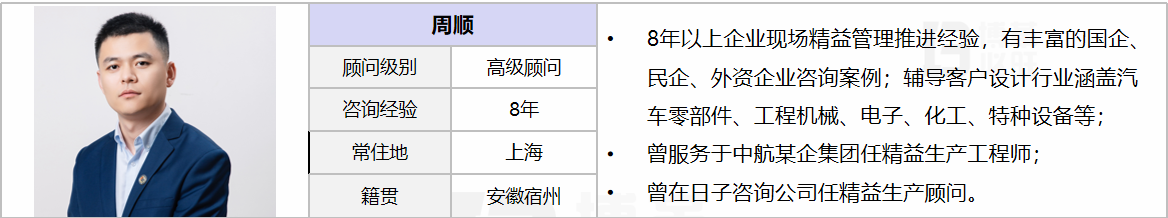 擅長業(yè)務(wù):工廠前期調(diào)研診斷、大項目管理、現(xiàn)場基礎(chǔ)管理提升、精益布局規(guī)劃、大型倉儲規(guī)劃、QCD改善項目落地、IE改善手法、PMC管理、質(zhì)量管理、精益生產(chǎn)成本降低、精益生產(chǎn)配送管理、精益物流-成套供應(yīng)物料模式、標準工時開發(fā)、SMED快速換模換線、ERP/MES管理軟件導入、現(xiàn)場6S改善、目視化提升、基層培養(yǎng)-打造班組管理、KAIZEN持續(xù)改善、企業(yè)文化推行和落地系統(tǒng)的研究;