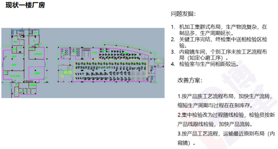 根據現狀調查和分析,博革咨詢認為,先合理規劃各樓層功能,再打造連續流的生產方式,降低成本金額,核心工作是要縮短生產周期、降低中間WIP,提高生產效率,改善現場環境。