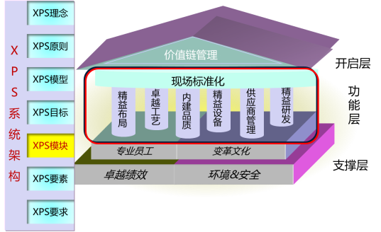 XPS持續變革系統分別從理念,原則,模型、目標、模塊、要素。要求等七個方面進行規劃和建模。既有深度,又有廣度,同時,建立評價要素和實施要求,也達到了集團戰略要求迅速推進精益變革的戰略要求。