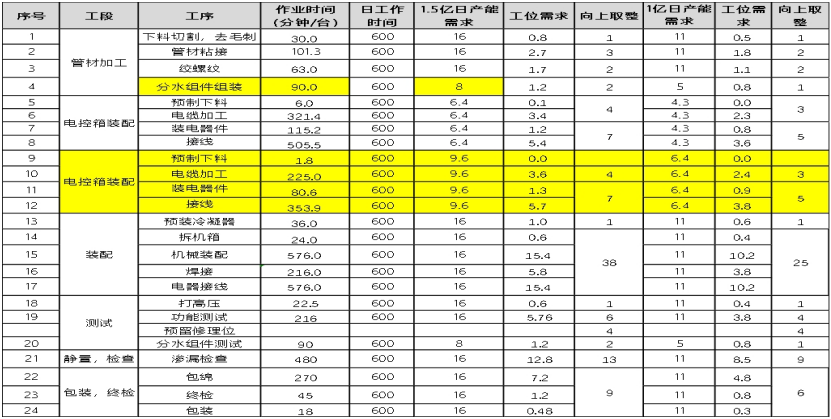 各工序工時(shí)測(cè)算及工位計(jì)算: